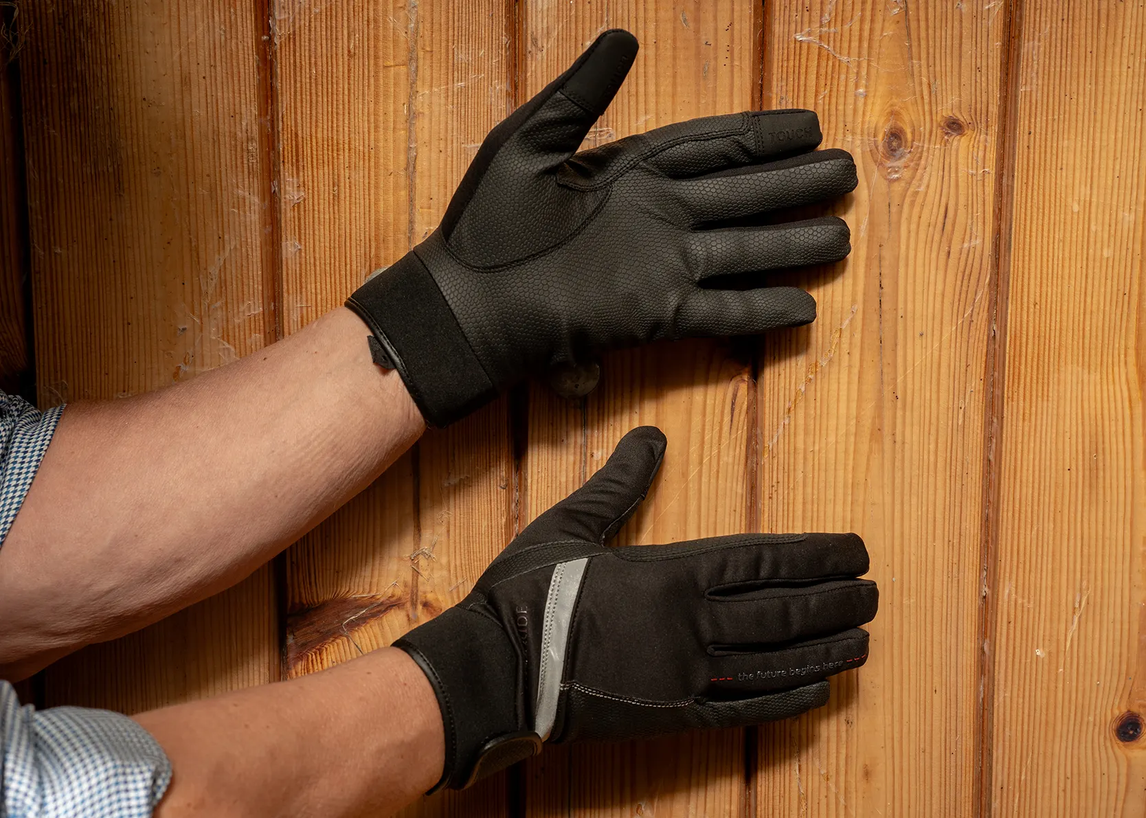 En mellan handske när det börjar bli höst. Med ett lite tjockare tyg på ovanhanden och ett tunt smidigt Vegan läder i innerhanden. Fodrad med fleece på ovanhanden. Ställbar neopren mudd runt handleden, tygelförstärkning, reflex samt mobil touch.